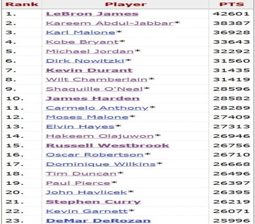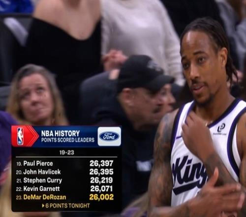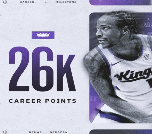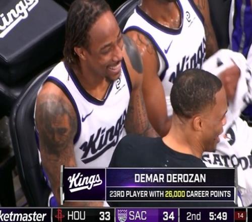 德罗赞常规赛生涯总得分突破26000大关,NBA历史第23人,现役第六人,仅次于詹姆斯、杜兰特、哈登、威少、库里。
