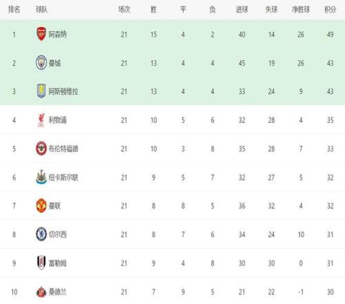 昨日凌晨结束的几场比赛,曼城1-1打平布莱顿、维拉0-0打平水晶宫、切尔西1-2输给富勒姆、2-2打平伯恩利、热刺2-3不敌伯恩茅斯、布伦特福德3-0大胜桑德兰、纽卡斯尔4-3险胜利兹联、狼队1-1打平埃弗顿。